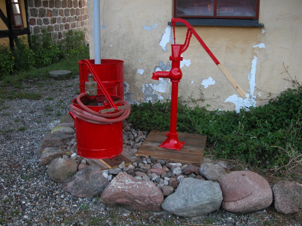 Peter finished renovating his water pumps – one from Denmark, one from the UK, plus the antique firemans bucket pump we bought some months ago. Unfortunately, our well (where the red pump is) appears to be full of sand, so neither of the pumps draw water. Still, with all the herbs I planted, the front of the milking shed looks lovely now.
